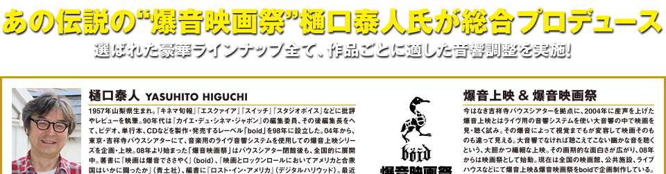 あの伝説の“爆音映画祭”樋口泰人氏が総合プロデュース 爆音映画祭 in 新宿ピカデリー〈boid〉http://www.boid-s.com/〈爆音映画祭〉http://www.bakuon-bb.net/