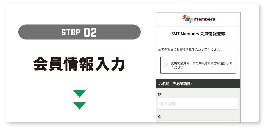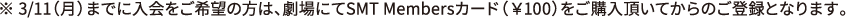 ※3月11日(月)までに入会の方は、劇場にてSMT Membersカード(100円)をご購入頂いてからのご登録となります。