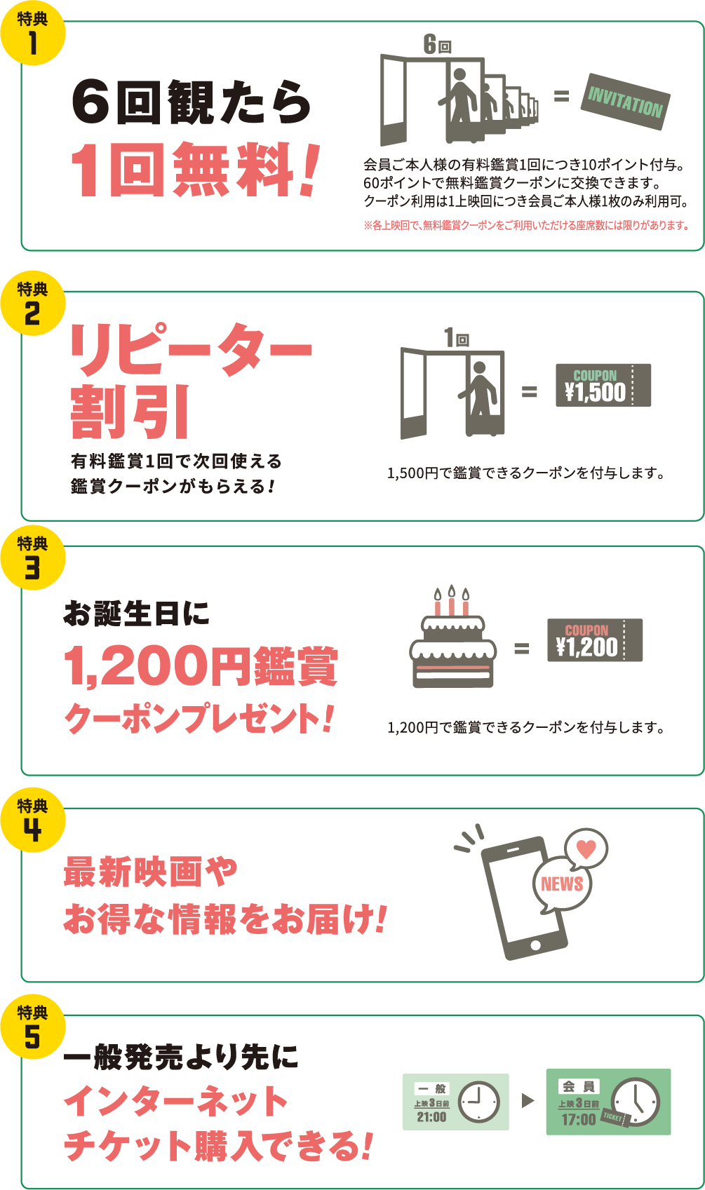 「6回見たら1回無料」、有料鑑賞1回で次回使える割引クーポンがもらえる「リピーター割引」、「誕生日クーポン」など映画をオトクに楽しむための特典がいっぱい!