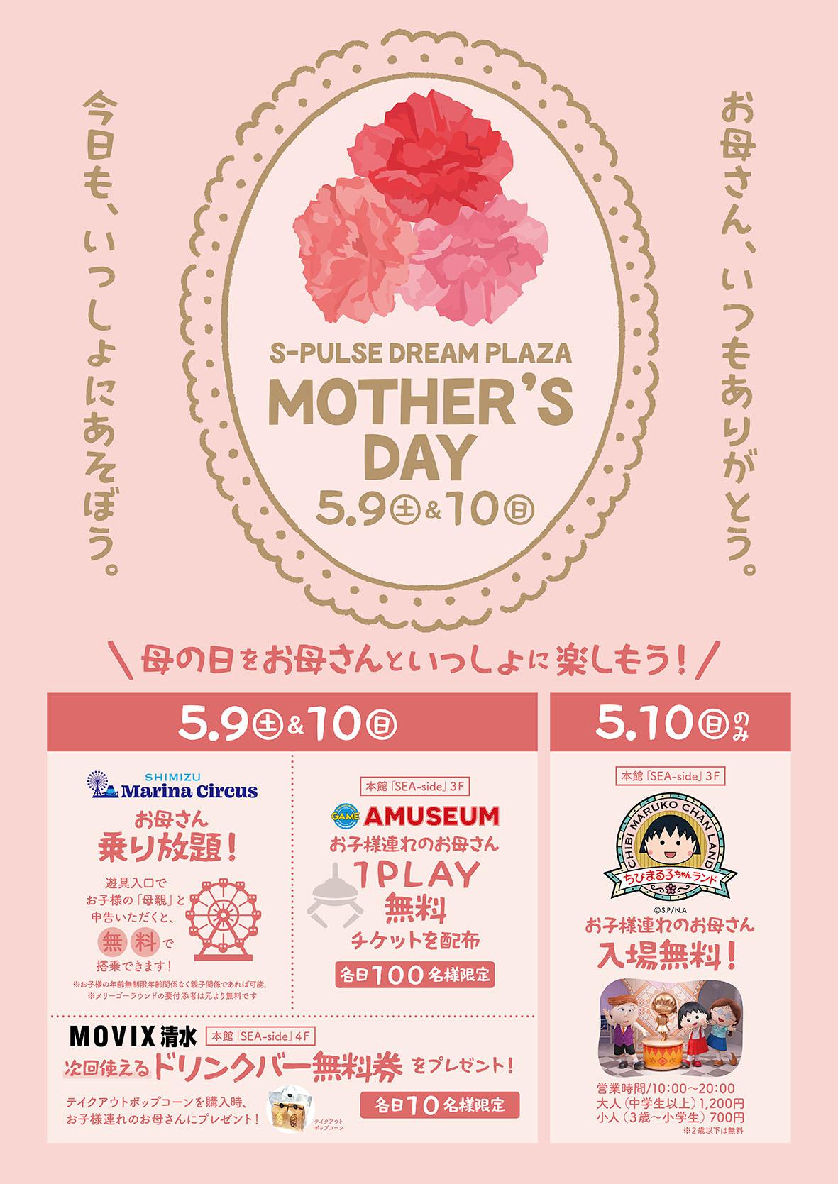 5/9(土)~5/10(日)の期間中で、お子様連れのお母さんにお得なサービスをご提供!該当期間に是非ご来場頂き、エスパルスドリームプラザをお母さんと満喫いただければと思います!