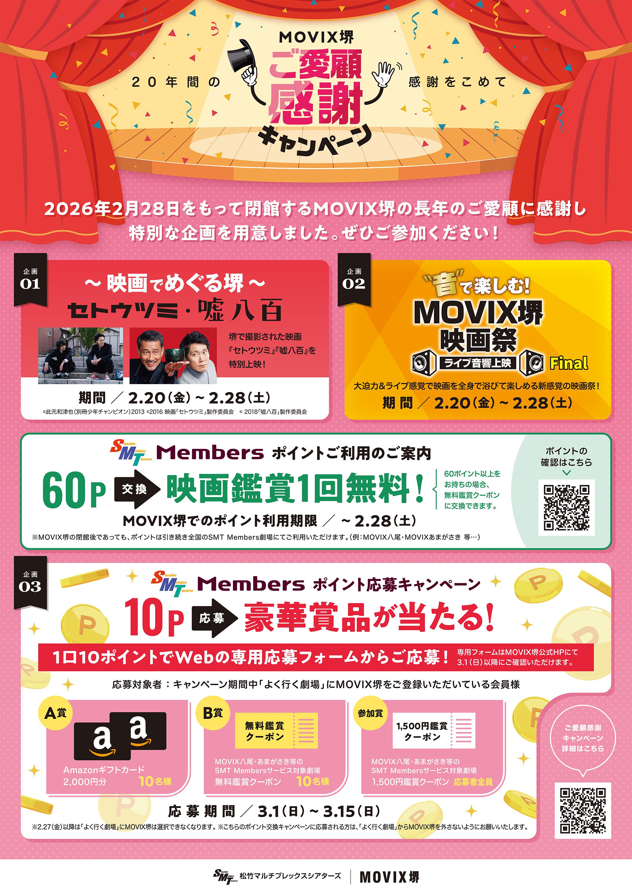 劇場からのお知らせ 2026年1月28日 20年間の感謝を込めて MOVIX堺 ご愛顧感謝キャンペーン MOVIX堺 映画祭 Final ライブ音響上映 詳細はこちら SMT Members会員 ポイント確認はこちら マイページログイン お知らせ一覧に戻る