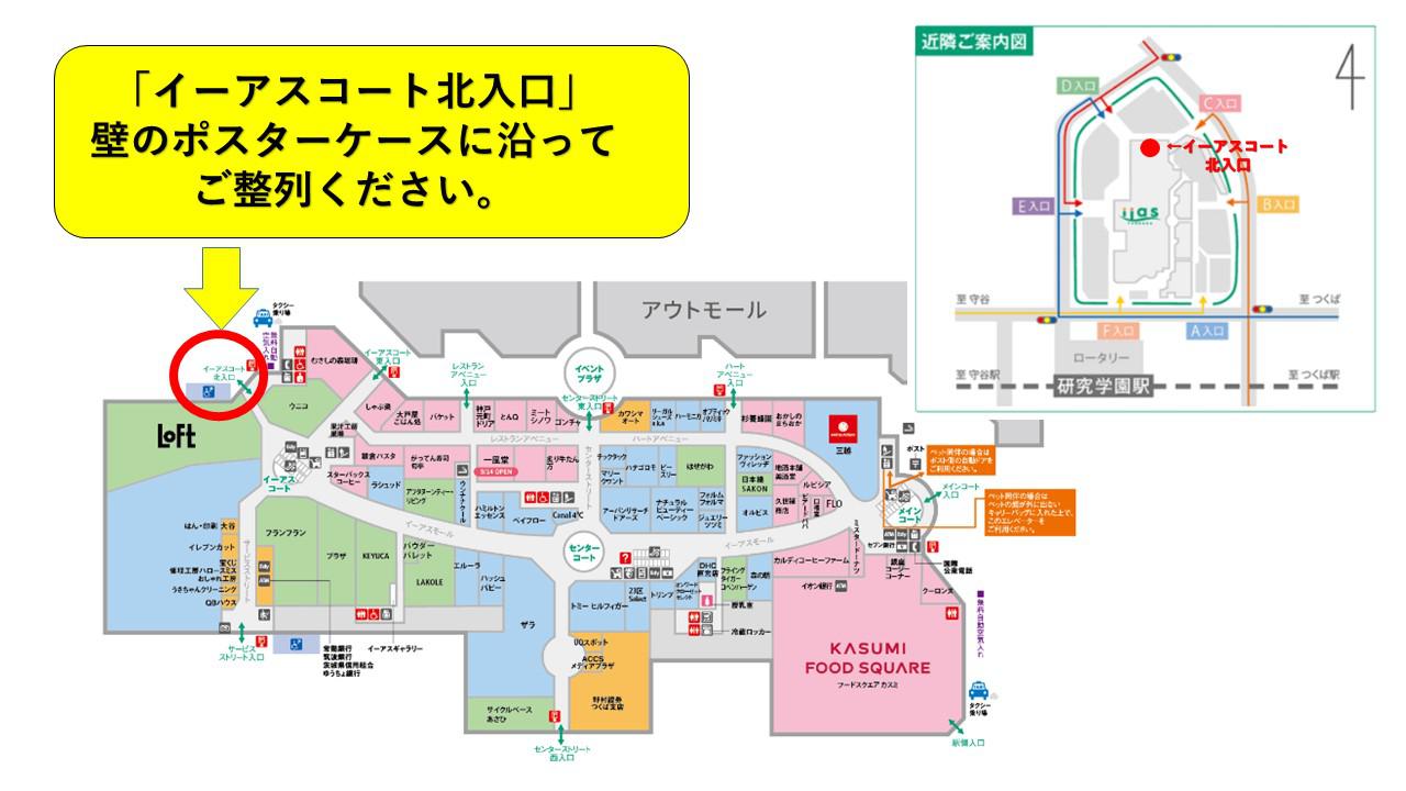 イーアスコート1F北入口前(下図参照)にお越しいただいた順に壁際に沿ってお並びくださいませ。
